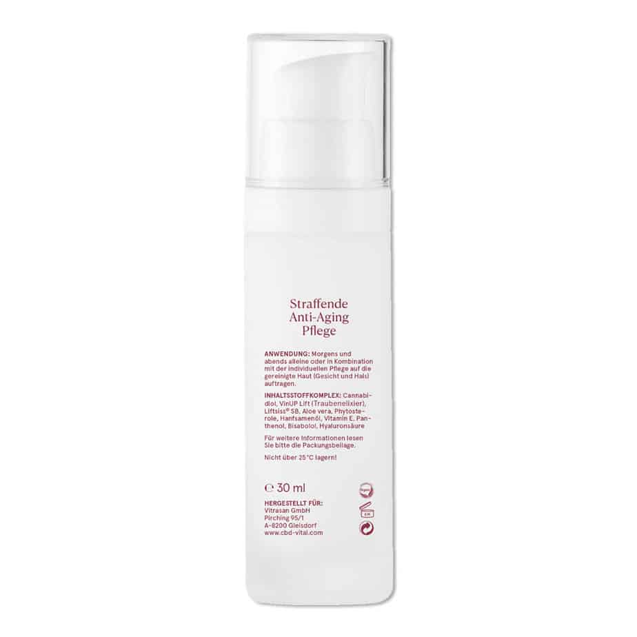 Aktivstoffkomplex: Cannabidiol, VinUP Lift (Traubenelixier), Liftsiss® SB, Aloe vera, Phytosterole, Hanfsamenöl, Vitamin E, Panthenol, Bisabolol, Hyaluronsäure
